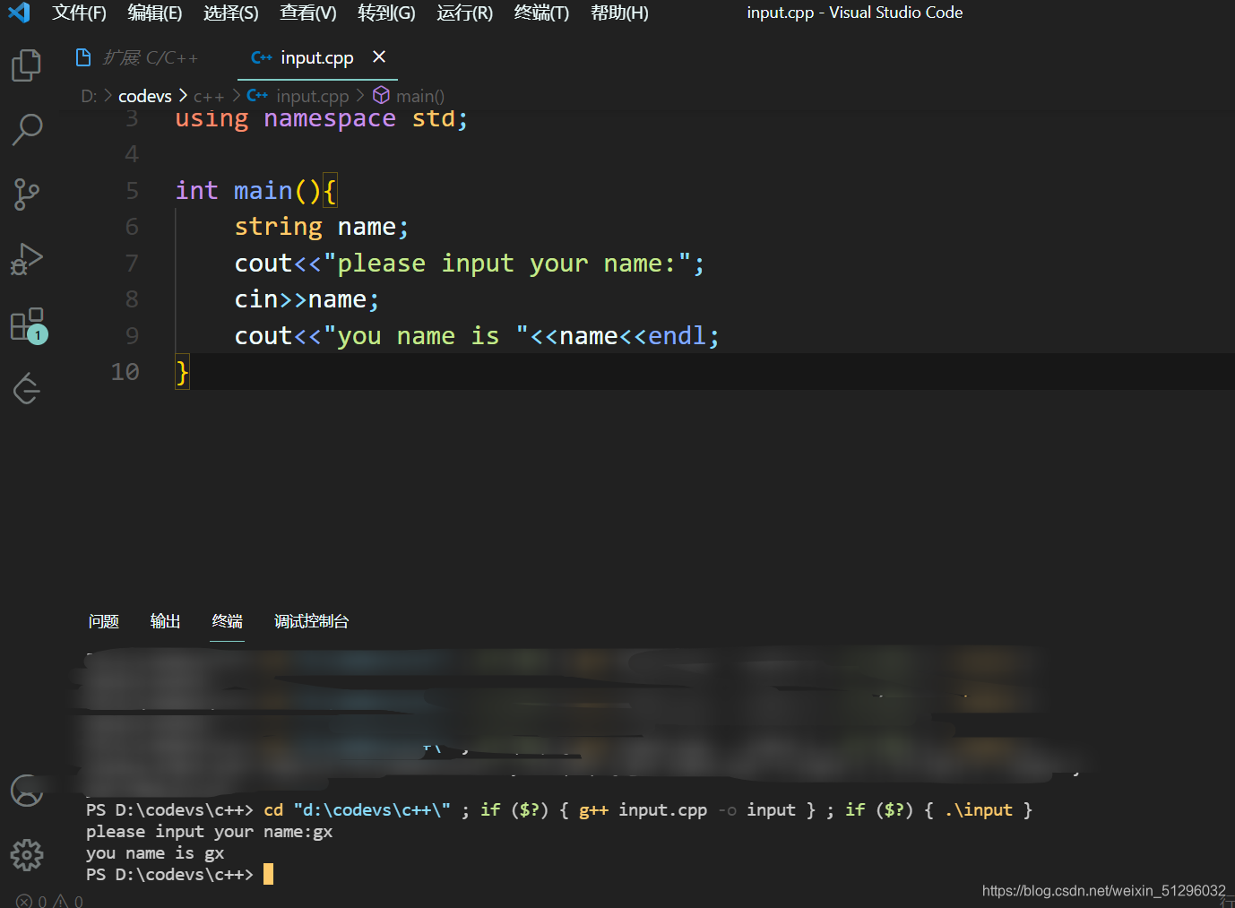 第二个,就是我们常用的C/C++插件,  安装好后我们单击左上角”文件“,选择”新建文件“  再次单击左上角”文件“,选择”另存为“,将文件名改为”hello.cpp“,后单击”保存“ 然后输入我们的死亡小代码, 输入完后一定要保存,一定要保存,一定要保存,然后点击右上角小三角,或者按Ctrl+Alt+N直接运行,就ok了。  ![[外链图片转存失败,源站可能有防盗链机制,建议将图片保存下来直接上传(img-aj3P1vRO-1629042280082)(D:\c++\vscode配置c++.assets\image-20210815232602855.png)]](https://img-blog.csdnimg.cn/fc3a452d539c4674af7ef305e95925bb.png?x-oss-process=image/watermark,type_ZmFuZ3poZW5naGVpdGk,shadow_10,text_aHR0cHM6Ly9ibG9nLmNzZG4ubmV0L3dlaXhpbl81MTI5NjAzMg==,size_16,color_FFFFFF,t_70) 看!大功告成!