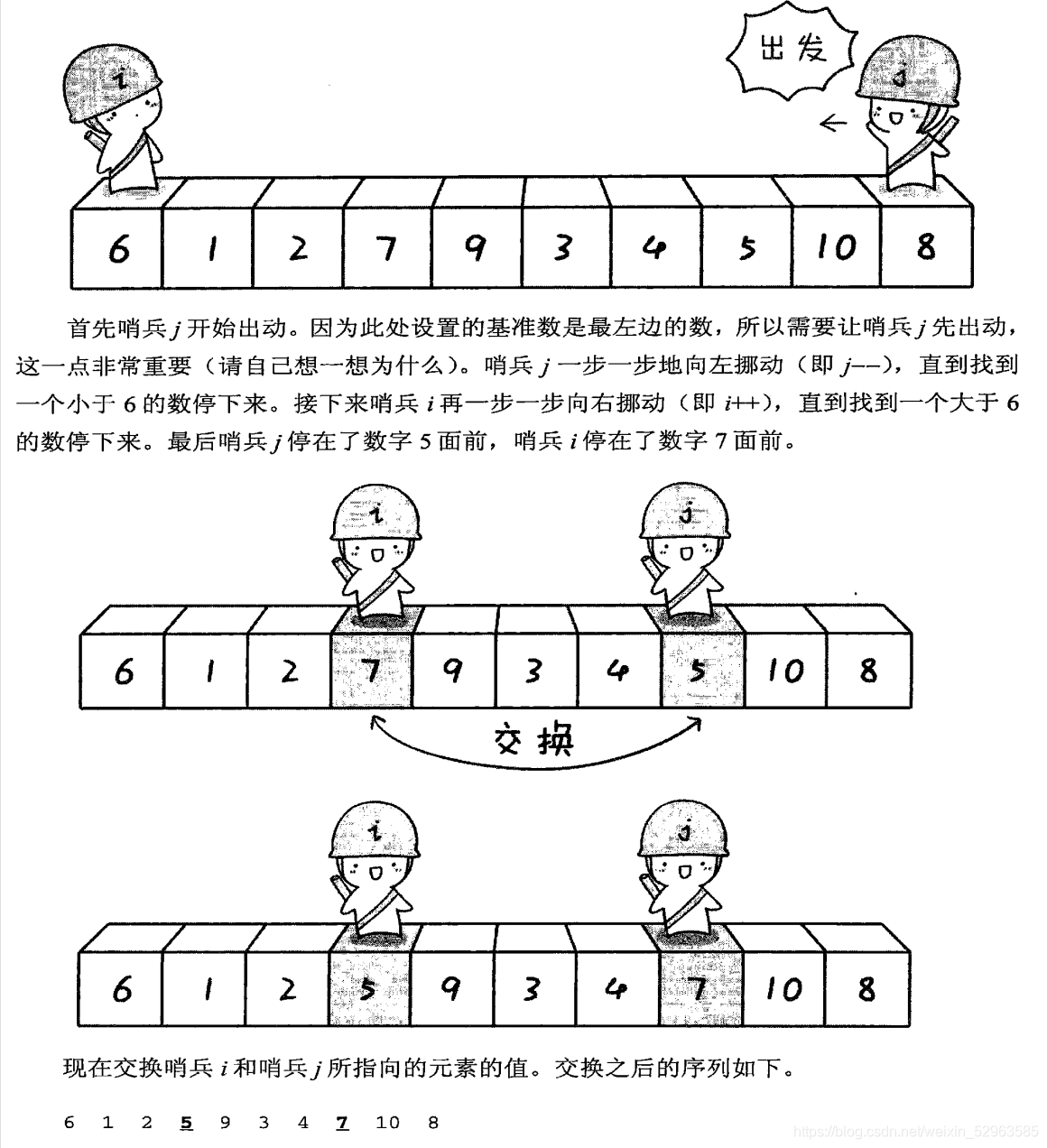 以此类推,第二次交换是9和4,然后i和j在3相遇,那么就将3和基准数交换 第一轮结束 然后按照上述方法分别处理6左右两侧的序列