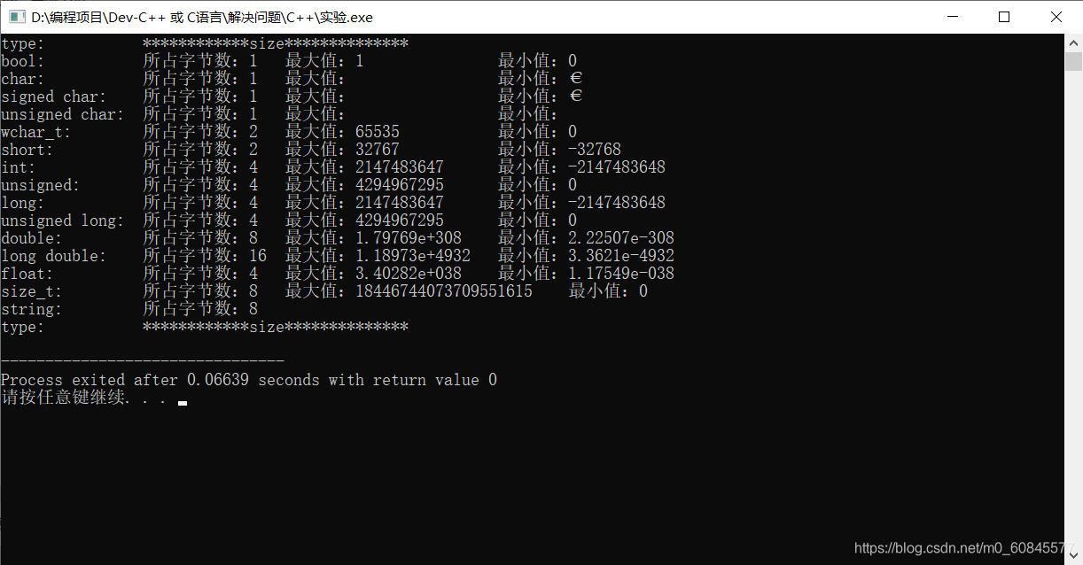 cout << "long double: \t" << "所占字节数:" << sizeof(long double);