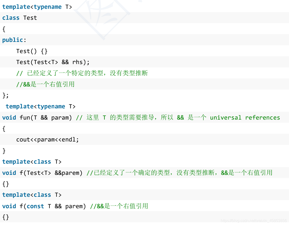 只有 T &&这样的引用才是未定的引用类型,其他单反具体一点的形式如const T && 、Test<T> && 就都是右值引用。