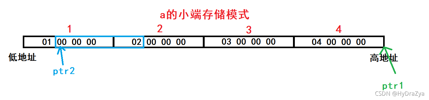 //由于ptr2解引用是通过小端(字节序存储)访问 00 00 00 02 ,打印的时候就是 02 00 00 00