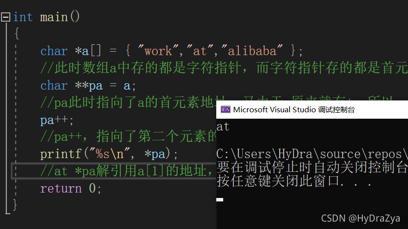 //pa++,指向了第二个元素的地址,也就是a[1]的地址,a[1]内部存放"at"常量字符串的首地址