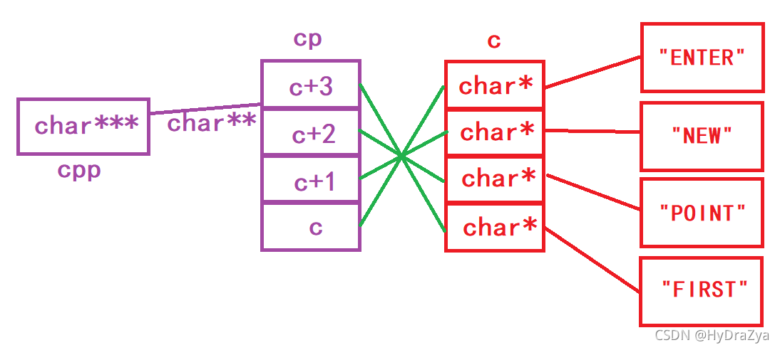 //又因为*所以c指向的是'c'对应的数组c中的"ENTER",又+3,指向了ENTER中的第二个E,所以%s打印出的结果是ER