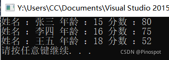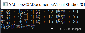 cout << "姓名 :" << s2.name << " 年龄 :" << s2.age << " 分数 :" << s2.score << endl;