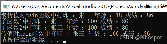 cout << "传值时main函数中打印 :" << s.name << " 年龄 :" << s.age << " 成绩 :" << s.score << endl;