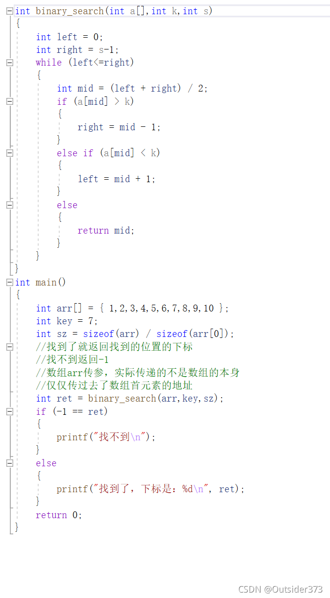 ?在这里,给大家分析一下,首先,我们先创建一个有序数组arr[],然后我们把要查找的7用int k表示,我们要确定这组数组的左下标0,右下标为sz-1,sz为数组的元素个数,即int left = 0,int right = sz-1;我们还要计算一下数组的元素总个数int sz =sizeof(arr)/sizeof(arr[0]);然后我们还需找出平均值int mid,如果arr[mid] < k,此时左下标left = mid+1,当arr[mid] > k,右下标right = mid-1,最后只剩一种情况直接打印break;出我们要求的mid,但是这只是一次查找,但是真正的二分查找需要好多次,那我们就需要让它循环while起来,需要一个条件left<=right,这说明中间还有元素,直到我们找到,但是当left>right时,此时我们可以大胆说明找不到,具体的代码如上图所示,这便是整个过程。小伙伴们赶紧int main(),return 0;敲起来试一试吧。