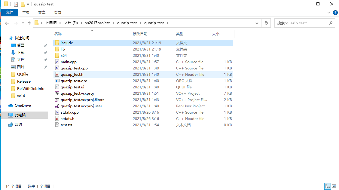 然后,选择项目,右键,打开项目所在文件夹  如下  在此处,新建文件夹include、lib。如下图  将前面编译好的quazip.lib放入lib中,在quazib中搜索.h,将所有的.h复制到include中  如下,配置完成  右键,项目属性,vc++目录  然后,打开main.cpp