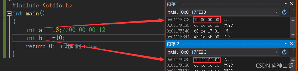 我们看看在内存中的存储  我们可以看到对于a和b分别存储的是补码。但是我们发现顺序有点不对劲。 这是又为什么?
