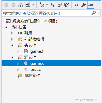 本人用的vs2017,在开始上代码之前还是说一下,两个源文件,test主要是杂七杂八的如何玩扫雷游戏等一些界面代码,主要的游戏实现是在game.c;至于game.h是装进行声明实现游戏功能的函数,以及定义一些常量。
