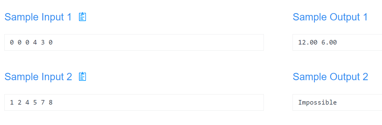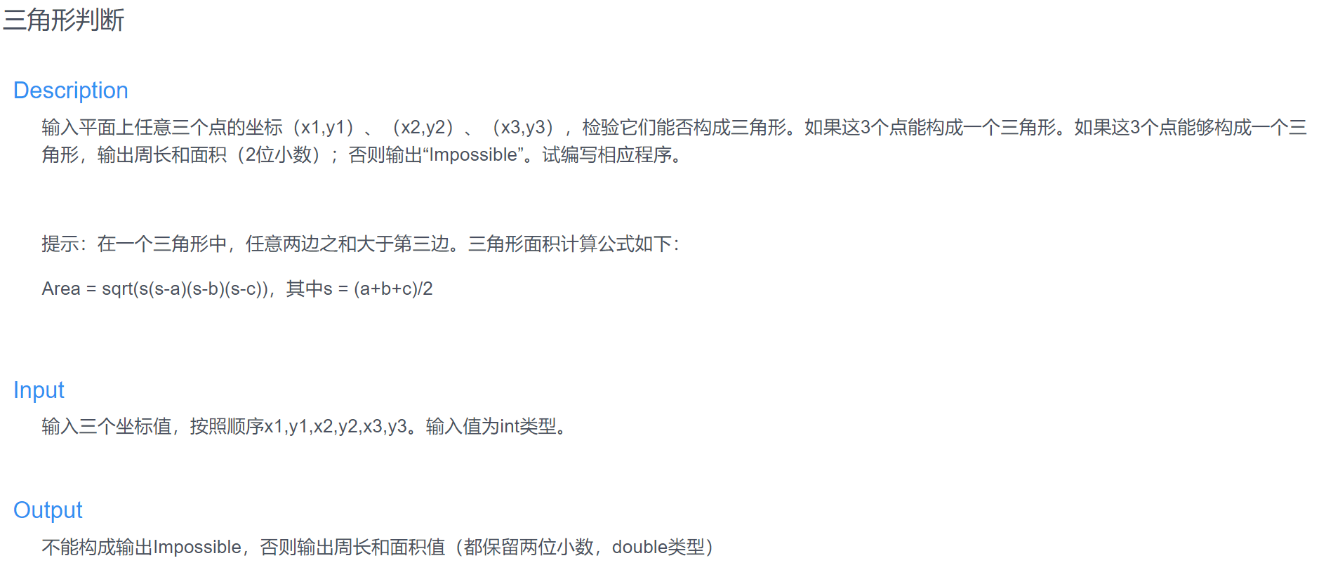 啦啦啦,我又来了!今天的内容重点是:判断练习和对浮点数的掌握程度。 题目如下:输入平面上任意三个点的坐标(x1,y1)、(x2,y2)、(x3,y3),检验它们能否构成三角形。如果这3个点能构成一个三角形。如果这3个点能够构成一个三角形,输出周长和面积(2位小数);否则输出“Impossible”。试编写相应程序。