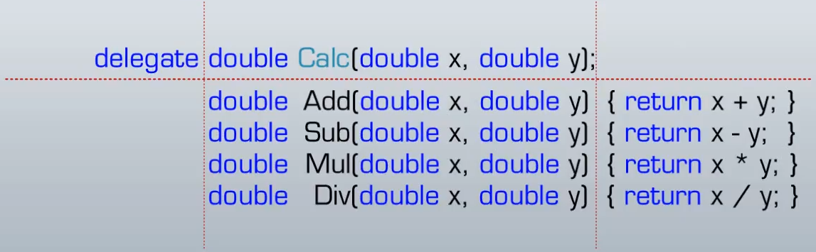 下图的第一行是委托类型的声明,而后面四行是委托可以封装的方法。