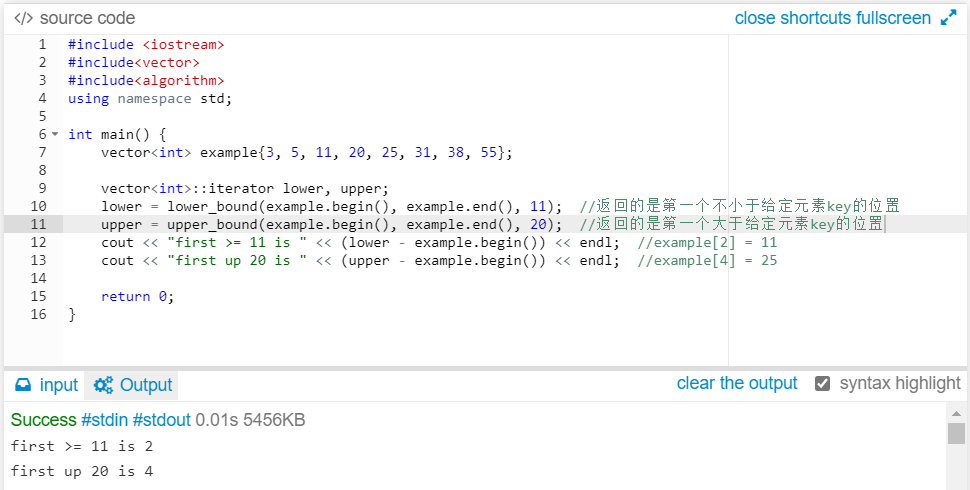 lower = lower_bound(example.begin(), example.end(), 11); //返回的是第一个不小于给定元素key的位置