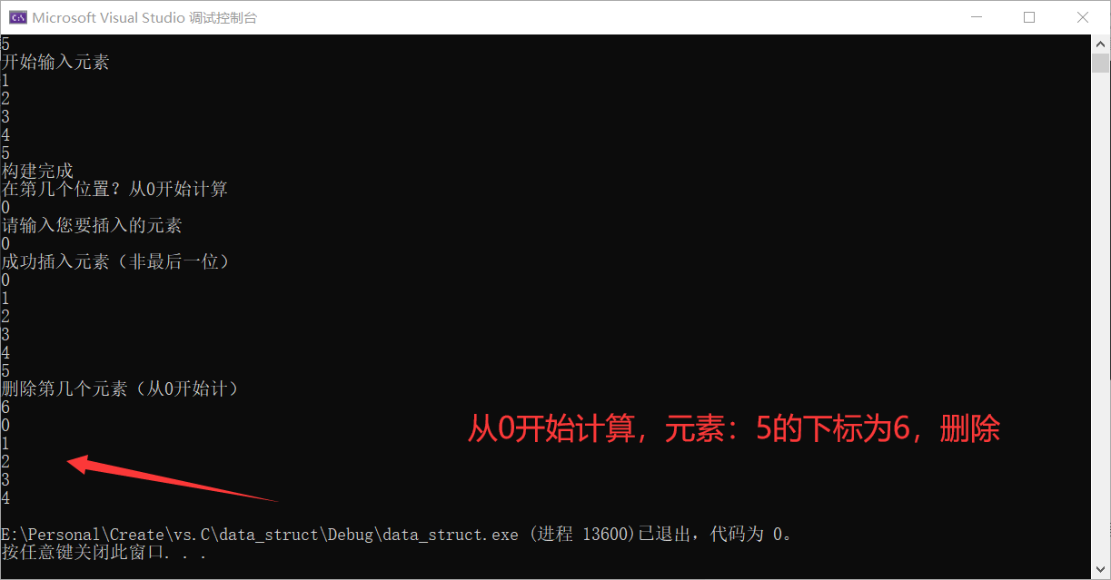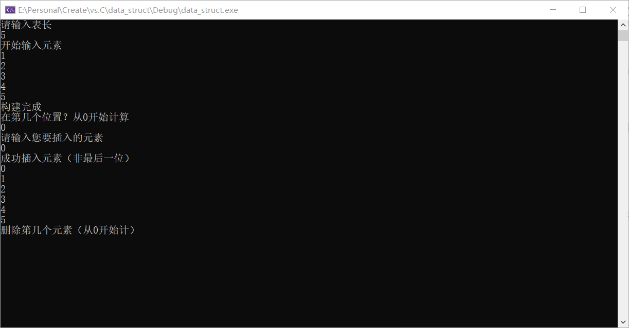 这段代码展现:构造一个普通线性表、在线性表中插入一个元素并遍历,以及删除一个元素再次遍历。 插入  删除