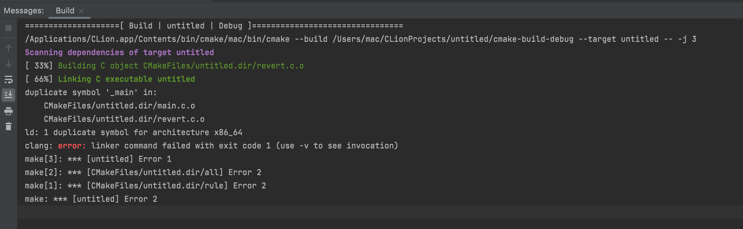 第一次使用Clion的时候,创建了两个main文件,结果运行报错了,报错情况如图片所示
