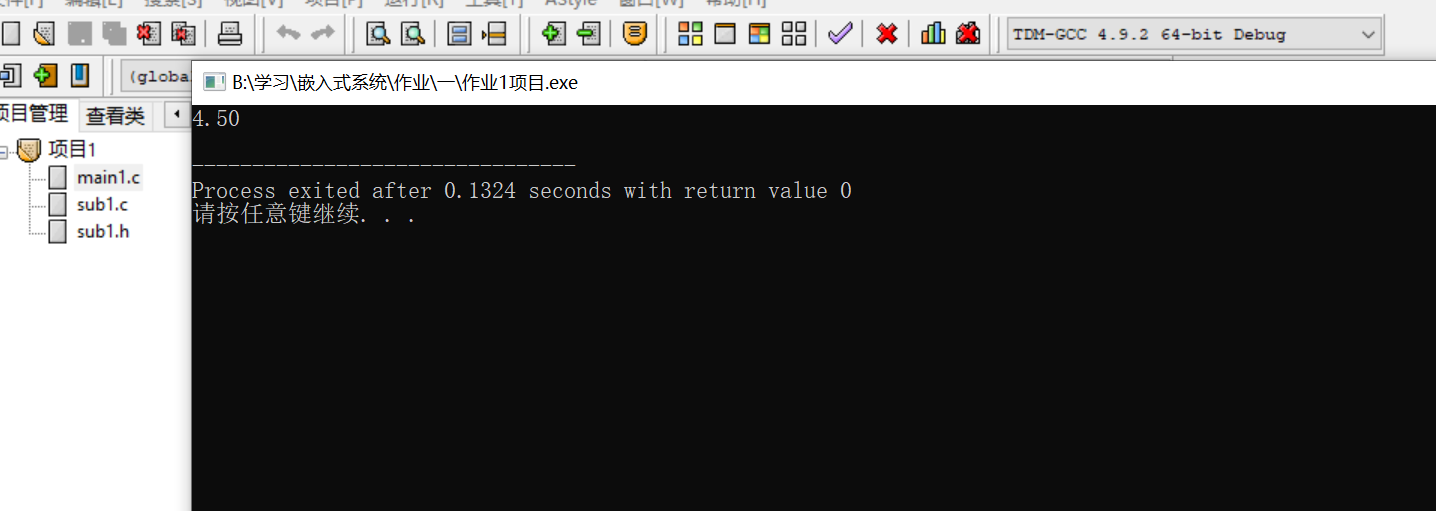 因为我的文件夹下有一个main1.c文件,sub1.h和sub1.c文件。此时如果在main1.c文件下直接点击运行按钮会报错,因为sub1.c并没有编译,因此会出现main1.c引用的sub1.c中的函数没有定义的问题。 - 解决方案:建立一个项目,将三个文件放进同一项目中