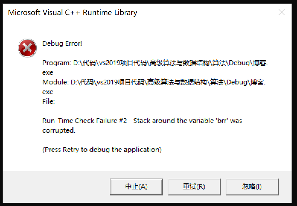 运行结果:  注意到,我们修改的是brr[7]的值,编译通过,但是发现arr[0]的值被修改了。 原因在于,我们定义的数组空间都在栈里面,而且是连续空间,每次我们定义一个数组的时候,栈里会在数组的两端多给我们开辟空间,通过代码及结果可以分析,两个数组之间是两个多出来的空间(因为brr[5],brr[6]都会提示非法修改,而brr[7]直接修改了arr[0]的值)如果我们越界试图修改这两个空间里的值,系统会提示我们非法修改,但是如果你越界过于厉害,会直接修改其他已经被分配走的空间的值(比如我们brr[7] = 20,其实访问修改的是arr[0]的值)。
