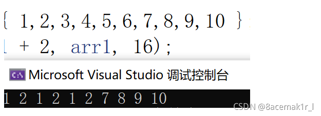 int arr1[] = { 1,2,3,4,5,6,7,8,9,10 }; my_memcpy(arr1 + 2, arr1, 16); for (int i = 0; i < 10; i++) { printf("%d ", arr1[i]); }