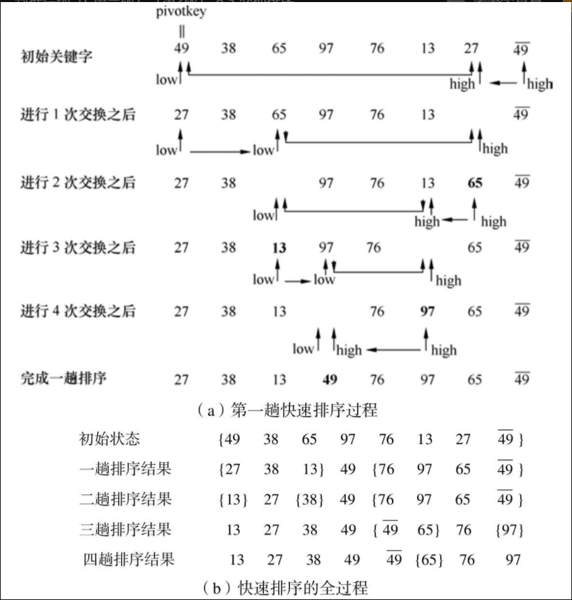 1)选中待排序列中的第一个元素为基准,复制到 r[0],然后将该位置置空。设置两个指针, low-指向第一个数据元素, high-指向最后一个元素 -