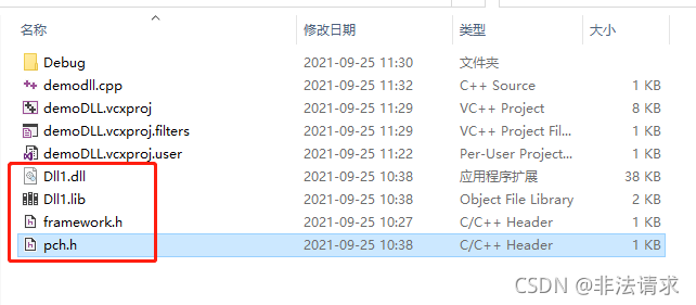 4、将动态库文件pch.h,framework.h,dll,lib四个文件复制到应用程序根目录