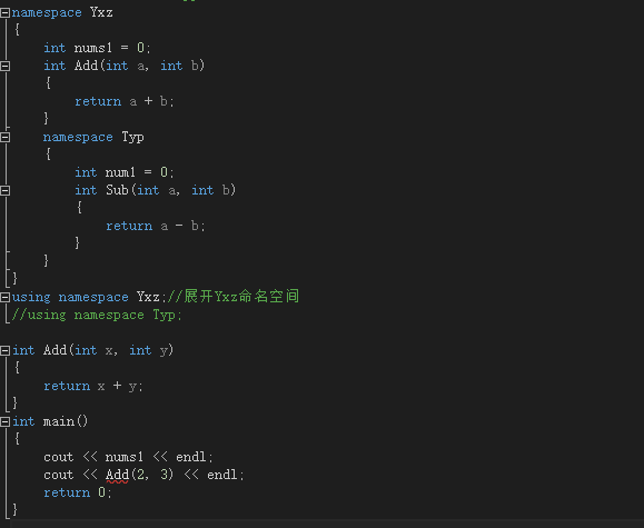 3:不展开,直接访问: 在部分展开的结尾说了 空间名+::可以访问空间中的东西,自然有下面的用法:  注意,上面是将Yxz空间全部展开,然后再main函数中去直接访问Add函数,有没有发现一个很牛逼的东西,Add同名报错的问题没了!使用这种方式就算展开后全局作用域中有同名函数也不用怕了,因为我指定了要使用哪个函数,编译器就不会因为不知道使用哪个而懵逼了。