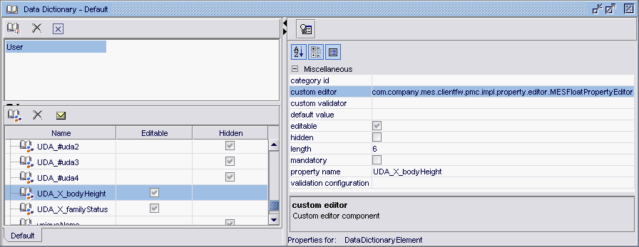 在本例中,自定义特性编辑器由数据字典元素Bodyheight(即smartEdit3)和Family status (即smartEdit4)智能编辑控件定义。 用户数据字典类的以下数据字典元素配置如下: ?UDA_X_bodyHeight:必须是浮点值(custom editor =com.company.mes.clientfw.pmc.impl.property.editor.MESFloatPropertyEditor) ?UDA_X_familyStatus:仅从提供的下拉菜单中获取值(custom editor =com.company.mes.clientfw.pmc.impl.property.editor.MESChoicelistPropertyEditor) 此配置将限制可在Body height 和 Family status 智能编辑框中输入的值的类型。有关配置数据字典元素的信息,请参见创建数据字典。