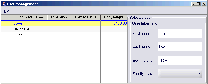 选择网格中的一行后,如果为所选用户对象定义了相应的属性(即firstName、lastName、X_bodyHeight UDA和X_familyStatus UDA),则会填充智能编辑框。 网格行双击下的以下代码定义了其信息将用于填充智能编辑框的用户: //Get the user information