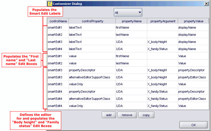 3.单击“自定义程序”按钮将控件绑定到对象的属性。将打开“自定义程序”对话框。  a、 使用对话框顶部的下拉菜单,通过选择以下选项之一定义过滤器。列出的属性将取决于所选控件: b、 单击[Add]添加新绑定。