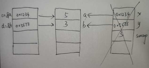 我们可以看到swap函数中只是交换了x、y中存储的地址值,也就是改变了x、y指向的变量的值,main函数的变量空间还是没有任何改变。