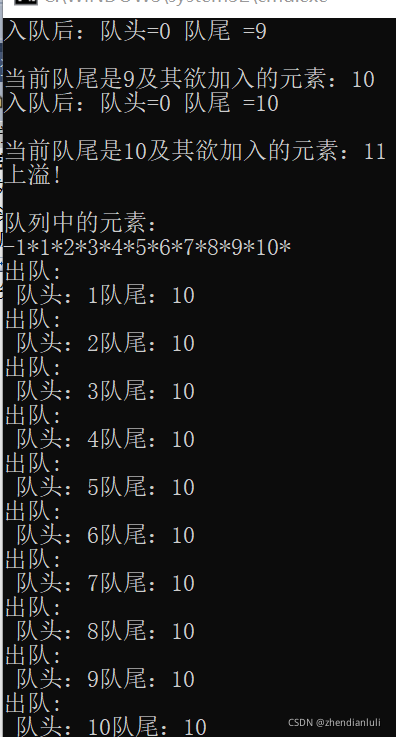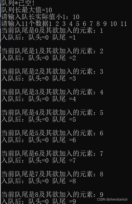 以上,再换成输入10个数据结果同输入11个数据是一样的,只不过不会产生上溢和队空。