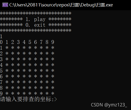 注意传入字符参数set,使mine数组初始化为‘0’,show数组都初始化为’*’。