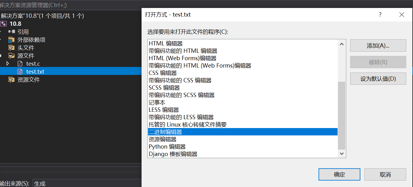 我们是看不懂的。  添加现有项,然后用二进制编辑器查看。  我们就可以看到这个信息。这是10000的十六进制形式。