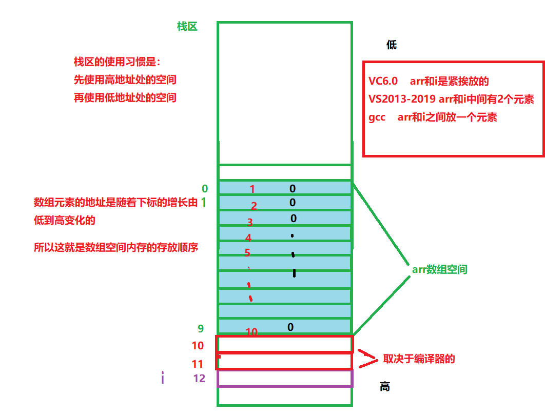数组内存是连续的,当i=10,打印之后的内存空间的内容,arr[10]不属于我们的数组,但是我们可以找到他对应的值。当i=12时,接下来进行arr[i]=0;语句,i变量存放的地址和arr[i]的地址一样,所以进行i=0,导致i<=12,程序死循环。所以要避免此类行为,尽量不要越界。