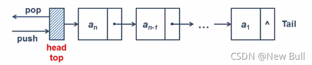 ?栈顶指针总是指向栈顶前面的头节点(head top)。在链式栈中,我们也需要使用空间申请的方式来获取空间内存,当然了,如果我们进行出栈操作后,我们就得释放空间。
