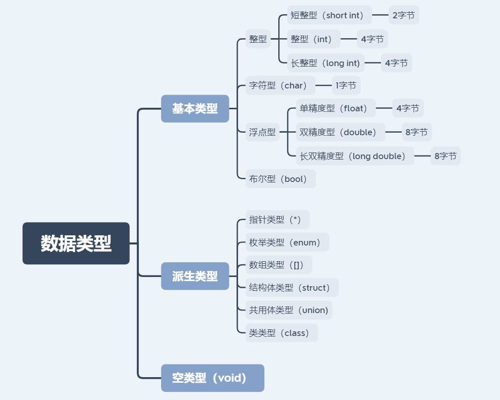 数据类型及其在Visual C++中字节数  说明: (1)一般在16位机的C++系统中,短整型和整型2字节,长整型4字节;在Visual C++中,短整型2字节,整型和长整型4字节。 (2)整型数据以二进制存储。 (3)在int和char型前面,可以加修饰符signed或unsigned(表示有无符号)。如果signed,则数值以补码形式存放,存储单元中的最高位(bit)用来表示数值的符号。 (4)在Visual C++中,对float提供6位有效数字,对double提供15位有效数字,两者的数值范围不同。