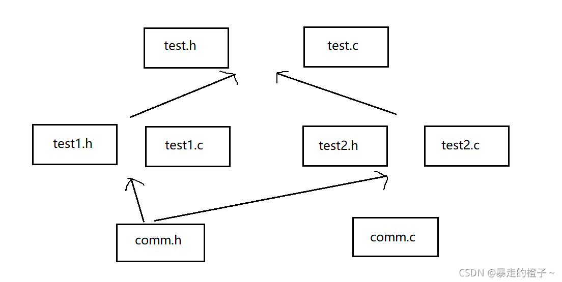 ?comm.h和comm.c是公共模块。 test1.h和test1.c使用了公共模块。 test2.h和test2.c使用了公共模块。 test.h和test.c使用了test1模块和test2模块。 这样最终程序中就会出现两份comm.h的内容。这样就造成了文件内容的重复。