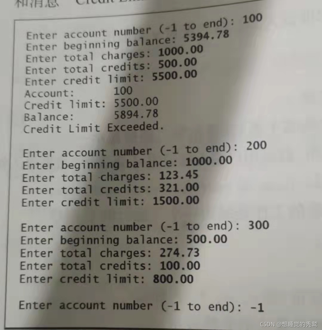 (信贷限额计算器)开发一个C程序来检测百货公司的一位消费者的消费额度是否已经超过其价卡账户的信贷限额的。对于每位消费者,有如下可用的信息: (a)账号(Account number) (b)月初余额(Beginning balance) (c)该消费者本月所有已支付的项目(Total charges) (d)该消费者账户本月所有已申请的贷款(Total credits) (e)允许的信贷限额(Credit limi) 该程序需要读入这些数据信息,计算新的余额(=月初余额+支付额一贷款) ,然后判断当前余额否超过该消费者的信贷限额。对于超过者,该程序应该显示该消费者的账号、信贷限额、新余和消息"Cedi Limit Excede 超出信贷限额)。输入/输出的对话样例如下: