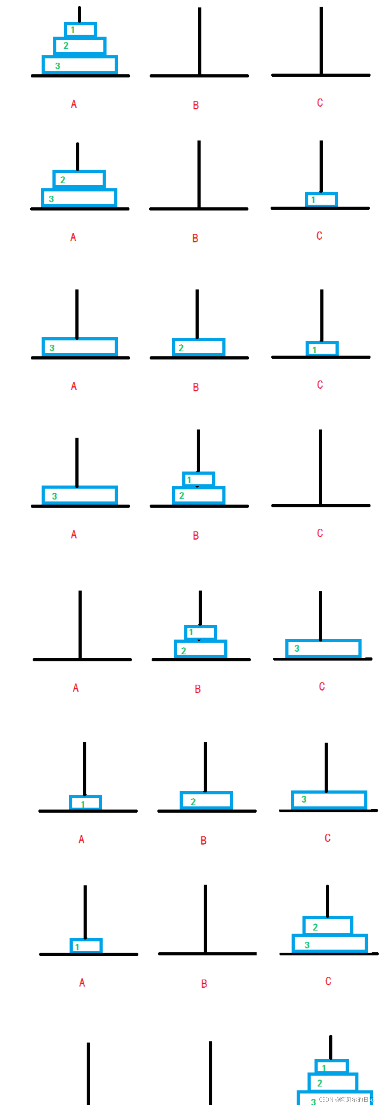 //printf n = 3执行完毕, 此时n = 3, 将3号从A移到C