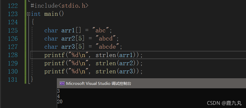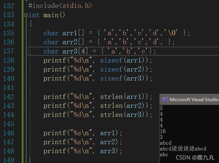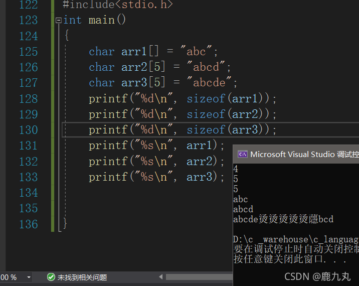 ?相信大家都知道,字符串是以'\0'字符为结束标志的,这个标志本身也占用一个内存,我们在输出的时候是看不到这个字符的,这是由编译器所决定的,因为编译器的符本身占用了一个字节,所以sizeof()这个关键字在计算数组所占内存时要比字符多一个,如图中的arr1和arr2,而在计算arr3时,结果只有5,但输出和图二中我们所看到的却不止5个字符,那么这是为什么呢?