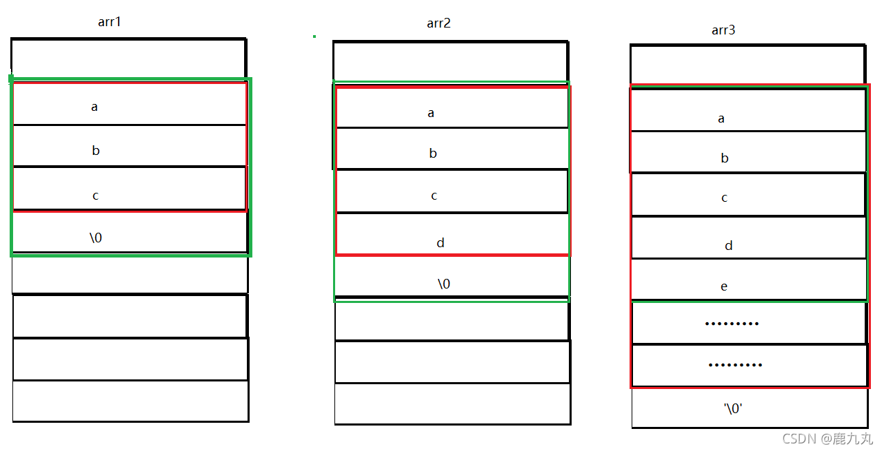 前两种是正确的定义方式,第一种之所以没有指定字符数组长度的原因是编译器能够自己推断出其长度,无需程序员自己设定,这也是我们比较推荐的一种定义方式,但注意内存长度编译器一经判定就无法再次更改,接下来我们分析一下第三种编译器为什么会出现乱码。