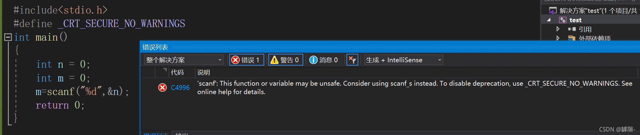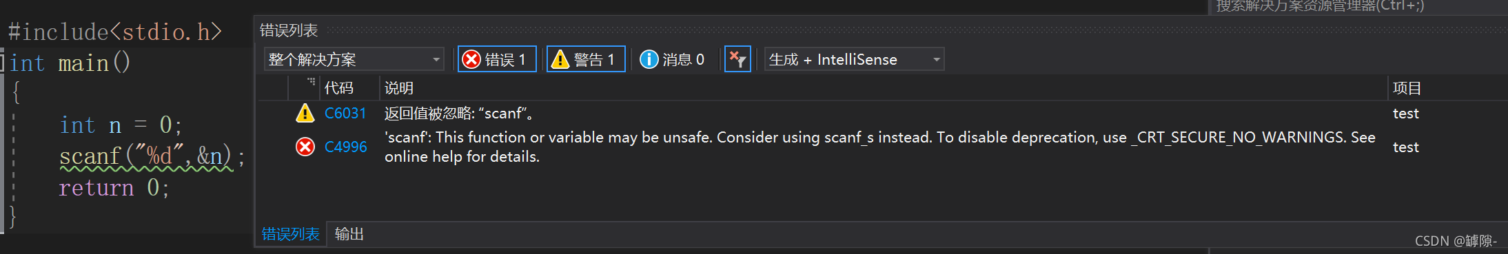 ? ? ? ? ?现在我们随便写一段关于scanf的代码,为什么会出现下面的错误呢?(警告就不要管他了,scanf的返回值表示读入字符的个数,在这里我们没有创建变量去接收返回值,所以出现警告。但我们用不到这个返回值,所以就让他警告着吧😄)