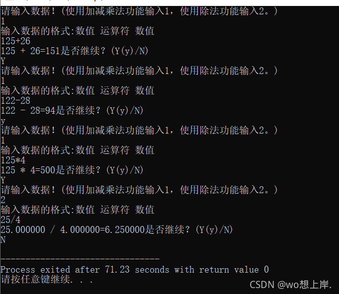 printf("请输入数据:(想使用加法减法乘法功能输入1,使用除法功能输入2)\n");