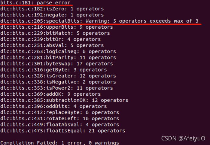 cd....进入文件夹,输入./dlc bits.c检测是否有错误,如下图: