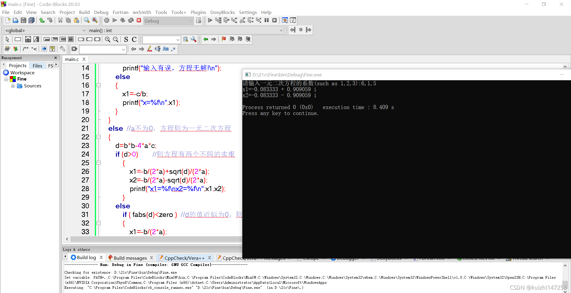 ????if?(?fabs(a)<zero?)??//a近似为0,方程则不是一元二次方程 ????{ ????????if?(?fabs(b)<zero?)?//b值近似为0,方程则无解 ????????????printf("输入有误,方程无解!\n"); ????????else ????????{ ????????????x1=-c/b; ????????????printf("x=%f\n",x1); ????????} ????} ????else??//a不为0,方程则为一元二次方程 ????{ ????????d=b*b-4*a*c; ????????if?(d>0)????????//则方程有两个不同的实根 ????????????{ ????????????????x1=-b/(2*a)+sqrt(d)/(2*a); ????????????????x2=-b/(2*a)-sqrt(d)/(2*a); ????????????????printf("x1=%f\nx2=%f\n",x1,x2); ????????????} ????????else ????????????if?(?fabs(d)<zero?)??//d的值近似为0,则有两个相同的实根 ????????????{ ????????????????x1=-b/(2*a); ????????????????printf("x1=x2=%f\n",x1); ????????????} ????????????else????????????????//方程无实根 ????????????{ ????????????????r=-b/(2*a); ????????????????l=sqrt(-d)/(2*a); ????????????????printf("x1=%f?+?%f?i\n",r,l); ????????????????printf("x2=%f?-?%f?i\n",r,l);