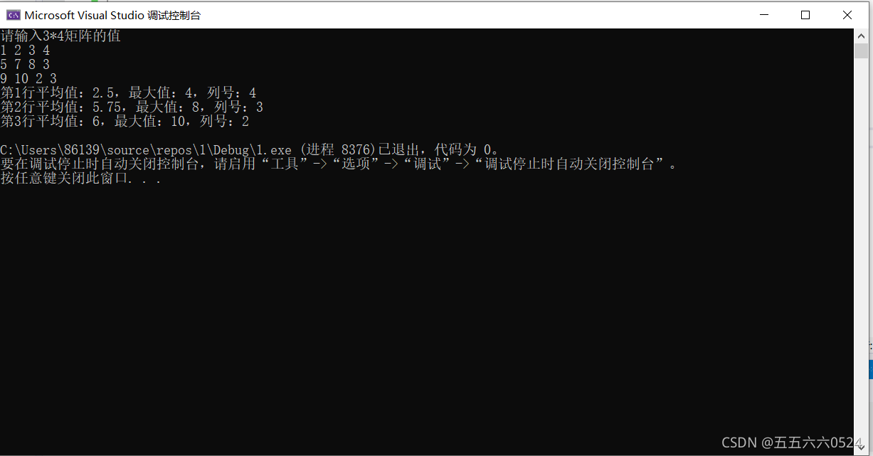 #include <iomanip> #include <iostream> using namespace std; int main() { ?? ?int a[3][4], i, j; ?? ?float avg[3]; ?? ?cout << "请输入3*4矩阵的值" << endl; ?? ?for (i = 0; i < 3; i++) ?? ?{ ?? ??? ?float b = 0; ?? ??? ?for (j = 0; j < 4; j++) ?? ??? ?{ ?? ??? ??? ?cin >> a[i][j]; ?? ??? ??? ?b += a[i][j]; ?? ??? ??? ?avg[i] = b / 4; ?? ??? ?} ?? ?} ?? ?for (i = 0;i < 3;i++) ?? ?{?? ??? ? ?? ??? ?int max =a[i][0], i_max = 0; ?? ??? ?for (j = 1; j < 4; j++) ?? ??? ?{?? ??? ? ?? ??? ??? ?if (a[i][j] > max) ?? ??? ??? ?{ ?? ??? ??? ??? ?max = a[i][j]; ?? ??? ??? ??? ?i_max = j + 1; ?? ??? ??? ?} ?? ??? ?} ?? ??? ?cout << "第" << i + 1 << "行平均值:" << avg[i] << ",最大值:" << max << ",列号:" << i_max << endl; ?? ?} ?? ?return 0; }