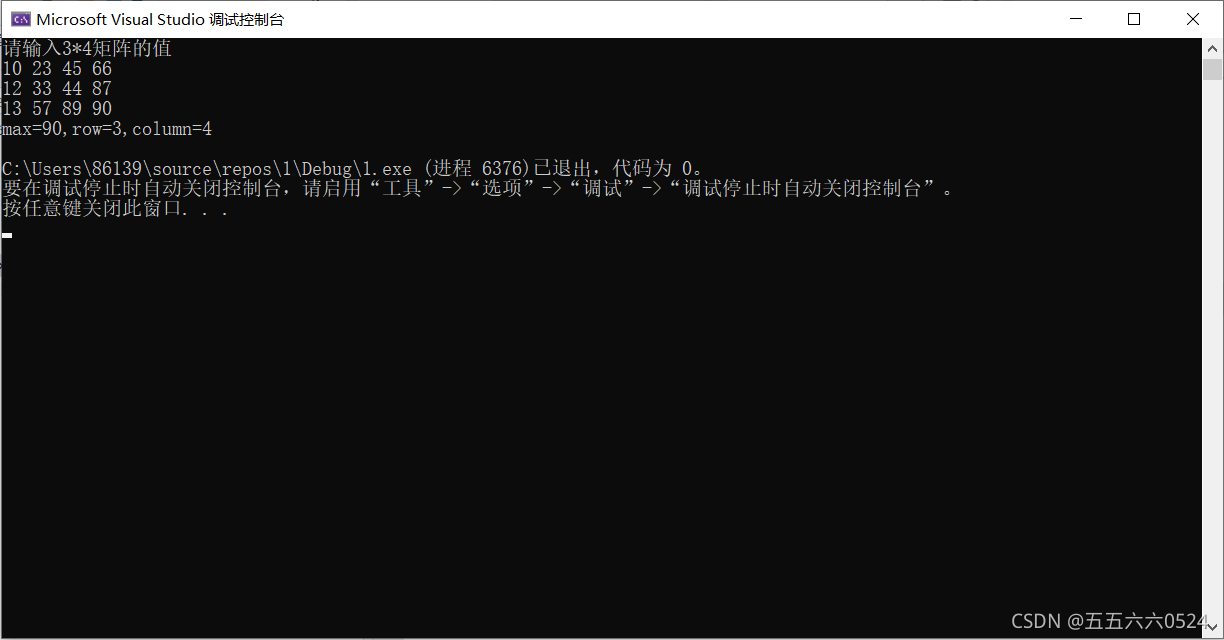 #include <iomanip> #include <iostream> using namespace std; int main() { ?? ?int a[3][4], i, j, max, i_max, j_max; ?? ?cout << "请输入3*4矩阵的值" << endl; ?? ?for (i = 0; i < 3; i++) ?? ??? ?for (j = 0; j < 4; j++) ?? ??? ??? ?cin >> a[i][j]; ?? ?max = a[0][0]; ?? ?for (i = 0;i < 3;i++) ?? ?{ ?? ??? ?for (j = 0; j < 4; j++) ?? ??? ?{ ?? ??? ??? ?if (a[i][j] > max) ?? ??? ??? ?{ ?? ??? ??? ??? ?max = a[i][j]; ?? ??? ??? ??? ?i_max = i+1; ?? ??? ??? ??? ?j_max = j+1; ?? ??? ??? ?} ?? ??? ?} ?? ?} ?? ?cout << "max=" << max << ",row=" << i_max << ",column=" << j_max << endl; ?? ?return 0; }