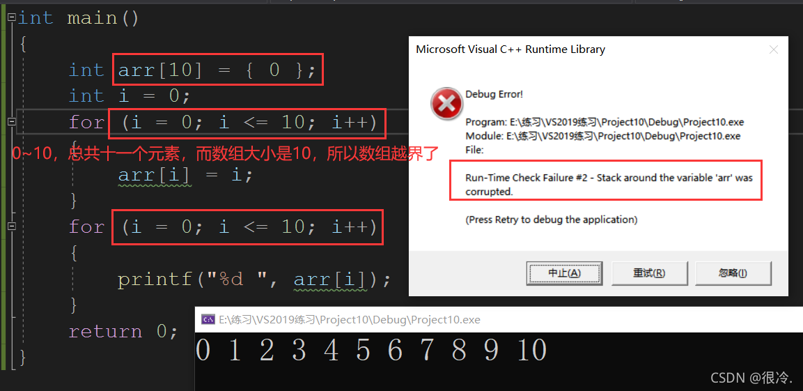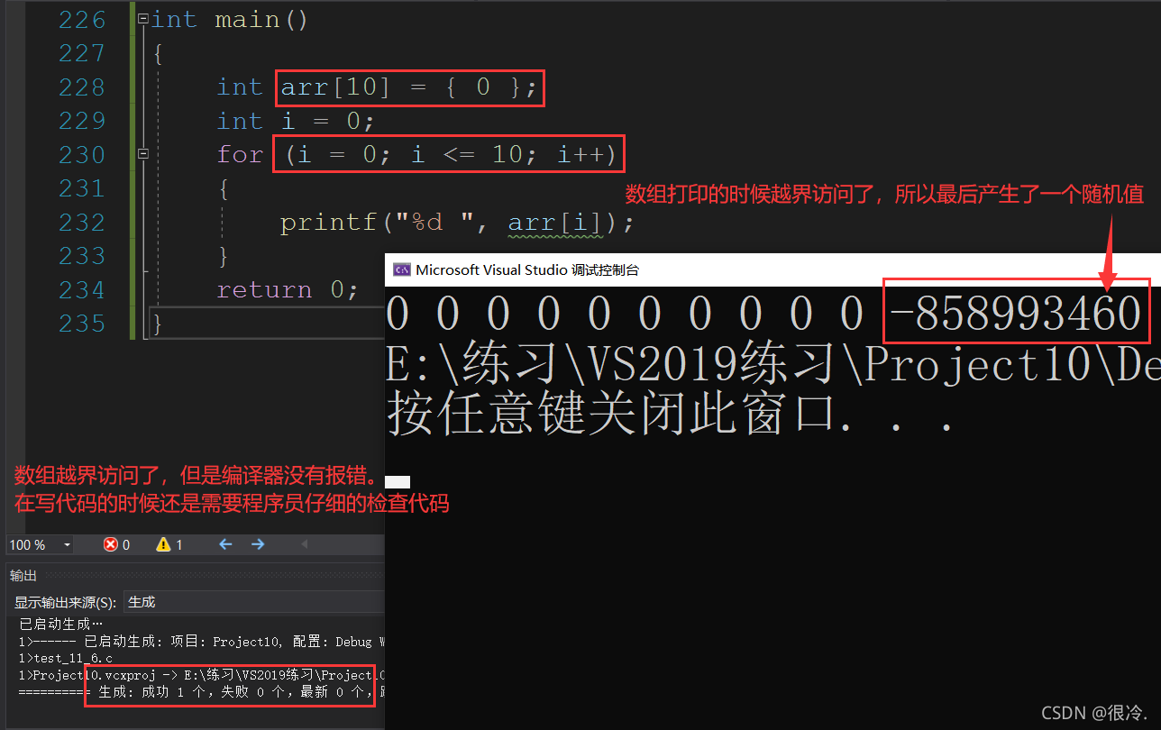 C语言本身是不做数组下标的越界检查,编译器也不一定报错,但是编译器不报错,并不意味着程序就是正确的。