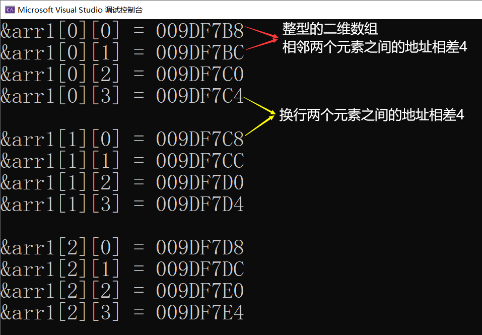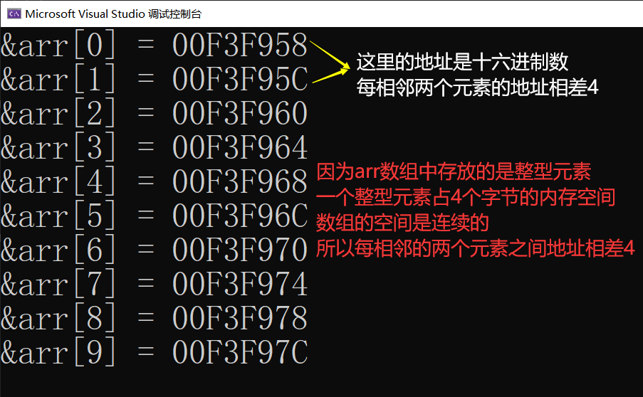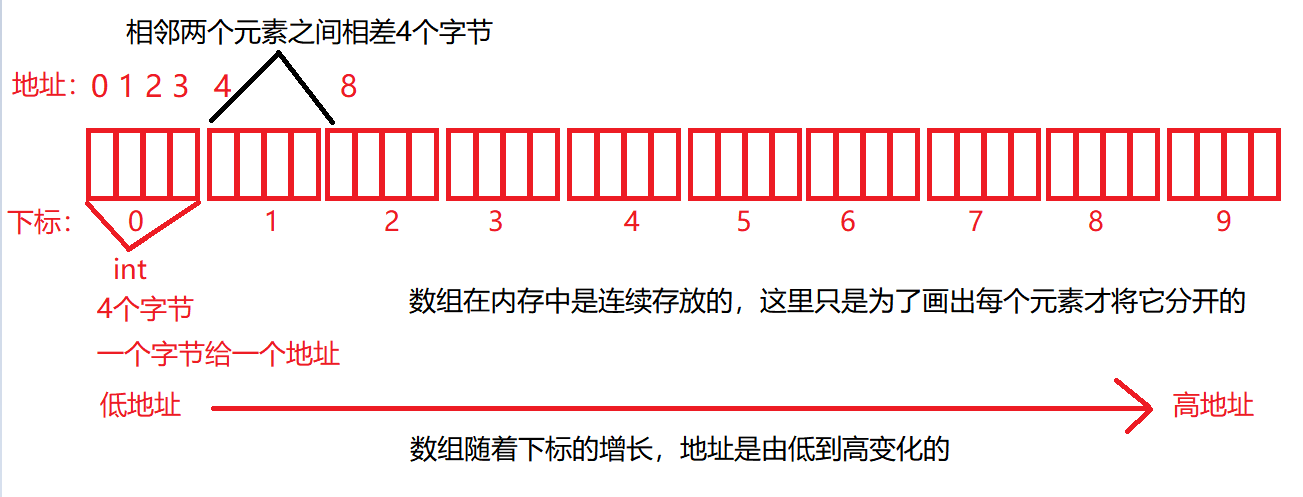 随着数组下标的增长,元素的地址也在有规律的递增。