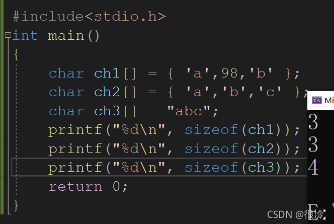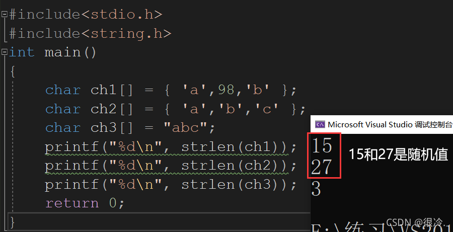 因为ch1和ch2中并没有存放字符 '\0',所以计算出的的是随机值,ch3中字符串末尾隐藏了字符'\0',strlen只计算 '\0' 之前的字符,所以计算出的结果是3。
