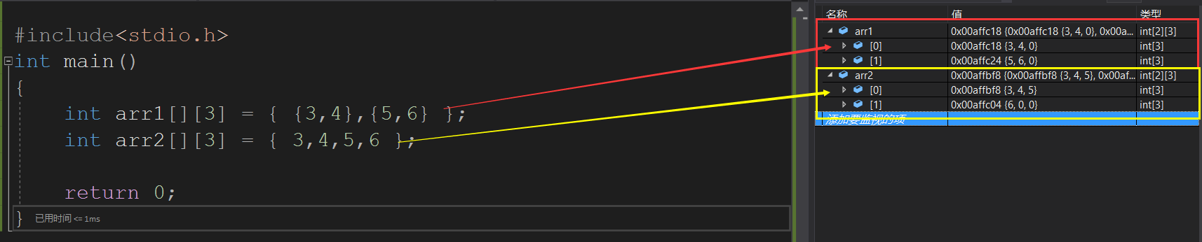 int arr1[][3] = { {3,4},{5,6} };