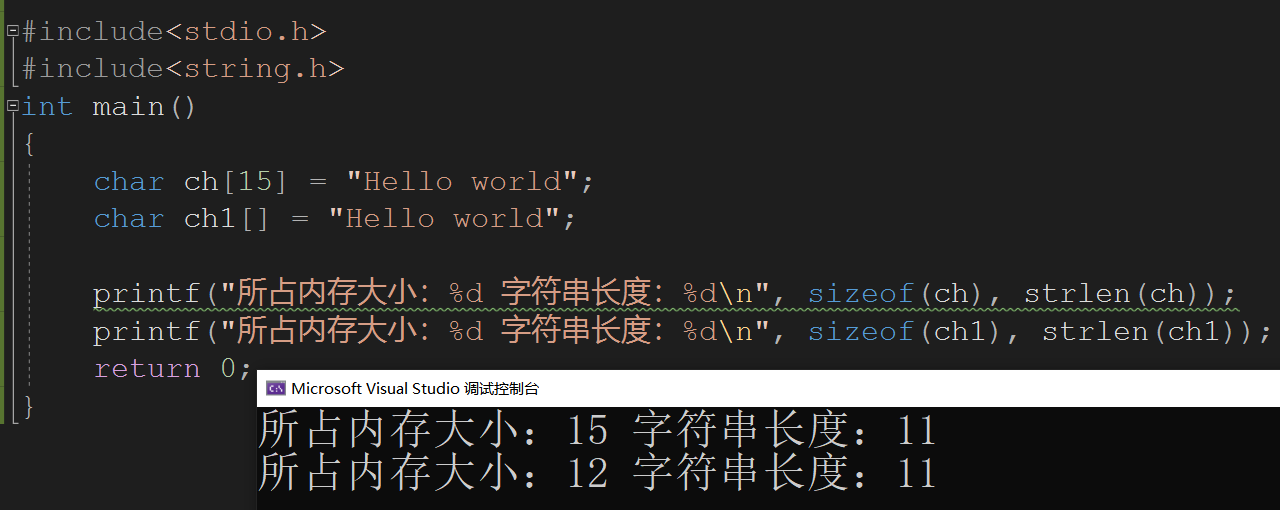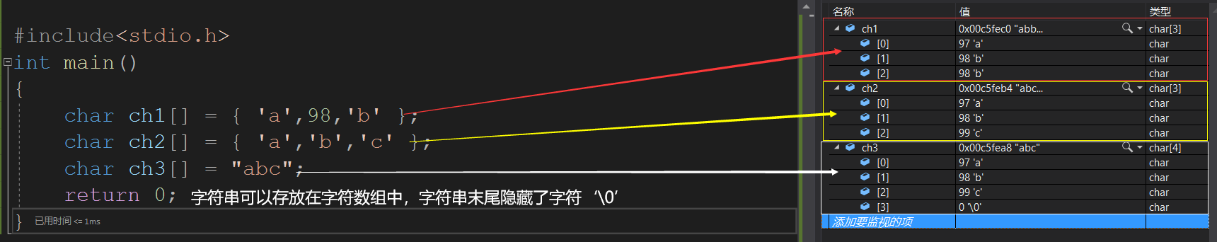 - ch1 与 ch2有3个元素,数组的大小是3个字节